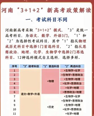 2025年起,河南省高考实行“3+1+2”模式;“3”即统一高考科目:为语文、数学、外语3门;“1”和“2”为选择性考试科目,其中“1”指从物理或历史科目中选择1门首选科目,“2”指从思想政治、地理、化学、生物学中选择2门再选科目。