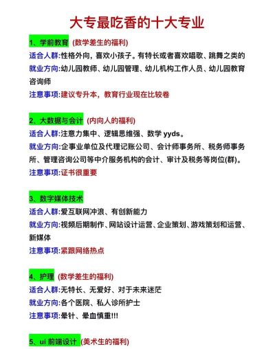 女生专科最吃香的专业前十有:人力资源专业、设计传播设计与制作、高铁乘务专业、旅游管理、工程造价、医疗美容技术、计算机专业、护理学、会计学、幼师。