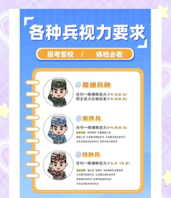 军校招生时对视力要求严格,指挥类军校专业要求裸眼视力在5.0以上,不允许做矫正手术。军校非指挥专业的考生任意一眼裸眼视力在4.6以上,无色盲色弱隐斜。或矫正后视力在4.9以上,术后半年无并发症即可。
