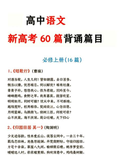 高中部分14篇:1.《劝学》 荀子2.《逍遥游》 庄子3.《师说》韩愈4.《阿房宫赋》5.《赤壁赋》 苏轼6.《氓》 诗经7.《离骚》 屈原8.《蜀道难》 李白9.《登高》 杜甫10.《琵琶行》白居易11.《锦瑟》 李商隐12.《虞美人》 李煜13.《念奴娇·赤壁怀古》 苏轼14.《永遇乐·京口北固亭怀古》 辛弃疾