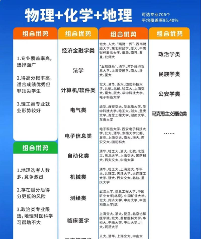 很多学生会担心,化学科目能报考的院校和专业不太行,如生物科学、化学工程、环境工程、材料工程被誉为“四大天坑”。其实学生更应该关注化学的选科组合,物理和生物是化学的好伙伴,物化生组合是目前专业覆盖范围比较广泛,能报考热门理工专业的选科组合。