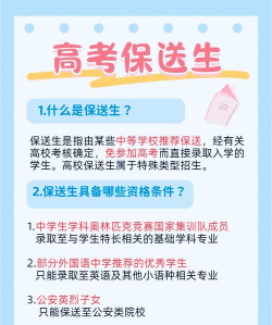 2、高考保送生:高考保送生是指成绩优异,表现相当优秀的学生,无需参加高考,经过学校推荐,即可被某所大学录取。