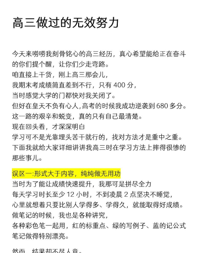 3、学会预习。课前预习十分钟,会让你的课堂四十五钟有事半功倍的效果。原因很简单,高中想逆袭就要变被动为主动,先了解上课老师要讲解的内容,带着疑问与老师一起学习,内心会有成就感,比较主动,吸收能力会加强,印象会比较深刻,学习能力也就增强啦。