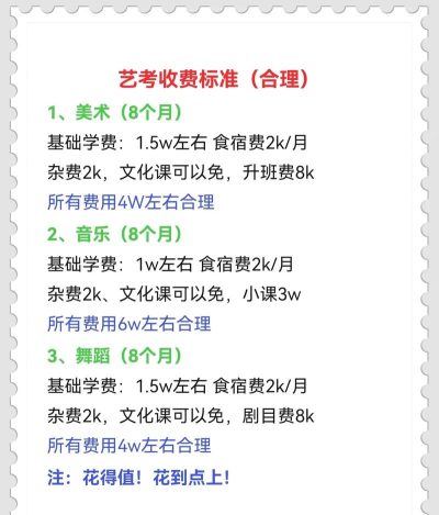 学表演艺考花费包括:食宿费+学习+艺考校考报名费,如果从高二下学期开始学习到12月份艺考完毕的花费,学表演艺考一般在北上广一线城市的艺考花费大概会在10-20万之间;2、3线小城市大概在3-7、8万左右。