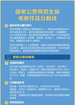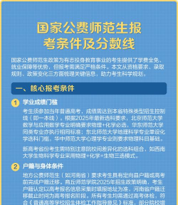 一、分数。国家公费师范生分数较高,一般在600分以上。省属公费师范生根据各县经济情况会有波动。二、户籍。国家公费师范生不限户籍,省属公费师范生要求定向县的户籍。三、体检。必须符合高考体检的相关要求。四、单科成绩。学校如有要求也必须符合。