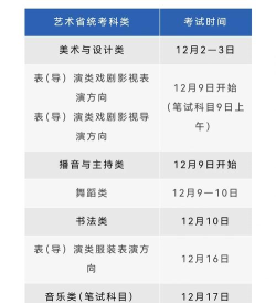 美术统考试科目为素描(头像、石膏像、静物组合)、色彩(静物组合、风景)、速写(人物速写、动态速写、场景速写),考试形式为写生、模拟写生(照片)、默写或模拟写生和默写。