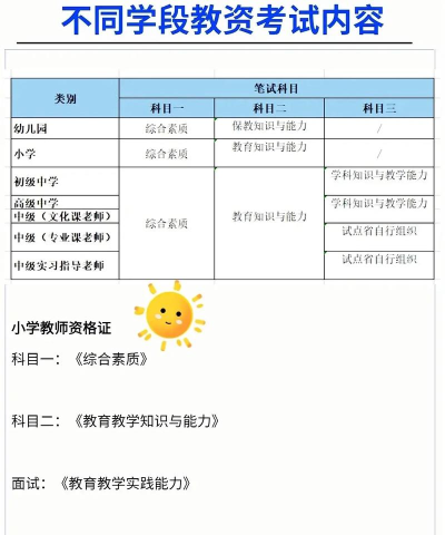 小学教资考试只包含综合素质考试大纲和教育知识与能力考试,幼儿园教资的考试比较特殊,包含了综合素质考试和保教知识与能力考试。