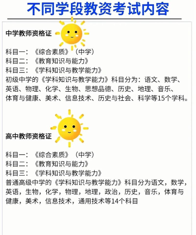 一般来说,教资考试的科目也是不会变化的。其中初中高中的教师资格证考试都包含了综合素质考试、教育知识与能力考试、学科知识与教学能力三个板块,其中学科知识与教学能力的难度还是很高的,主要是初高中的题目。