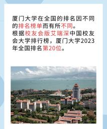 厦门大学(XiamenUniversity),简称厦大(XMU),位于福建省厦门市,是由中华人民共和国教育部直属副部级综合性研究型全国重点大学,教育部、国家国防科技工业局、福建省和厦门市重点共建高校,位列国家“双一流”、“211工程“、“985工程”,首批学位授权自主审核单位,入选国家“2011计划”、“珠峰计划”、“强基计划”、“111计划”、卓越法律人才教育培养计划、卓越医生教育培养计划、卓越工程师教育培养计划、新工科研究与实践项目、国家大学生文化素质教育基地,是全国首批深化创新创业教育改革示范高校,全国大学生创新创业实践联盟、“21世纪海上丝绸之路”大学联盟牵头发起高校,中欧商校联盟、中国人工智能教育联席会创始会员,大学通识教育联盟、CDIO工程教育联盟、海西医学联盟、中国高校自贸区研究联盟成员。