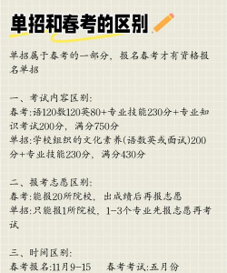 春考和单招在招生对象、报名地点、志愿填报方式、招生院校方面不同。高职单招是指经教育部批准,由高等职业院校“单独确定入学标准、单独组织入学测试、单独实施招生录取”的一种招生录取方式。下面整理了一些相关的信息,供大家参考。