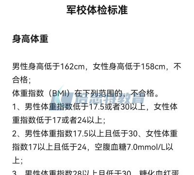 对于军校体检什么时候开始这个问题,当下并没有准确的答案,一般来讲高考军校体检以《军队院校招收学员体格检查标准》为标准。军校体检日期并无规定,以报考院校的通知为准。凡报考军队院校的考生,除参加全国高考外,还必须参加军队院校组织的面试检测。
