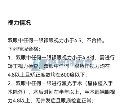 任何一眼裸眼视力低于4.8,需进行矫正视力检查,任何一眼矫正视力低于4.9或矫正度数超过600度,不合格。